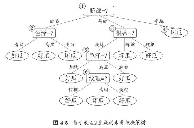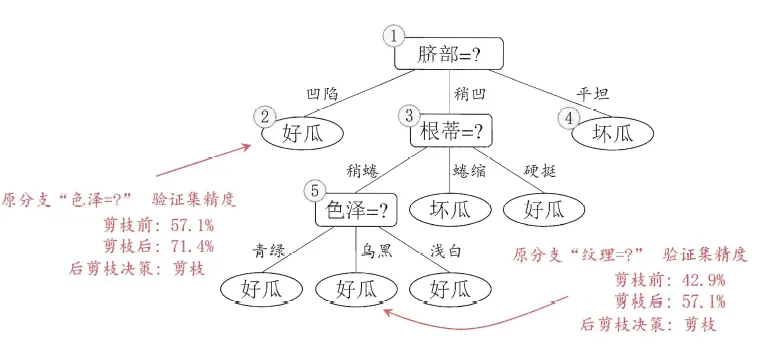 后剪枝则是先从训练集生成一颗完整的决策树,然后自底向上地对非叶子结点进行考察,若将该结点对应的子树替换为叶结点能带来决策树泛化性能提升,则将该子树替换为叶结点