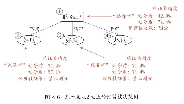 预剪枝是指在决策树生成过程中,对每个结点在划分前先进行估计,若当前结点的划分不能带来决策树泛化性能提升,则停止划分并将当前结点标记为叶结点